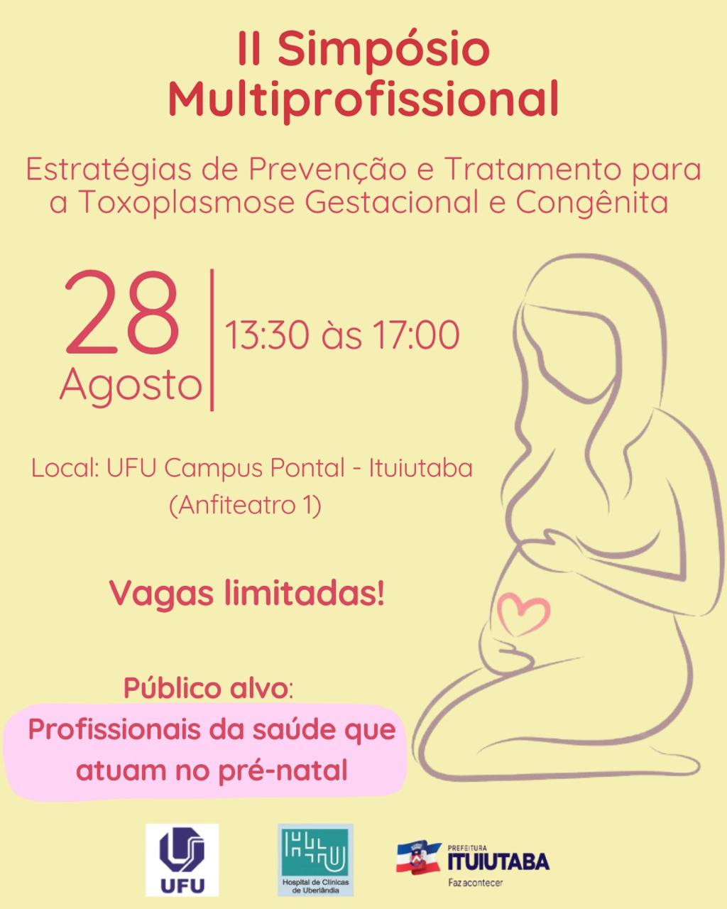 No dia 28 de agosto, com início às 13:30 no Auditório 1 da Universidade Federal de Uberlândia, no Campus Pontal (UFU PONTAL) ocorrerá o II Simpósio Multiprofissional sobre Estratégias de Prevenção e Tratamento para a Toxoplasmose Gestacional e Congênita. Este evento foi proposto pelo grupo ToxoPrevine e tem como objetivo contribuir para a promoção de saúde no contexto da toxoplasmose e estabelecer uma rede de compartilhamento de informações e experiências. Para isso, promoveremos a discussão entre profissionais da saúde que acompanham as gestantes durante o pré-natal, na cidade de Ituiutaba e cidades vizinhas, e pesquisadores sobre a toxoplasmose gestacional e congênita.